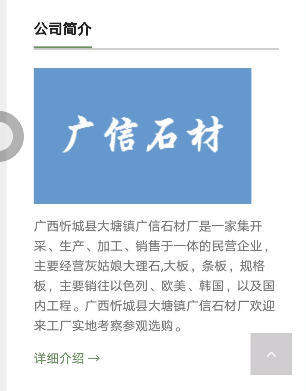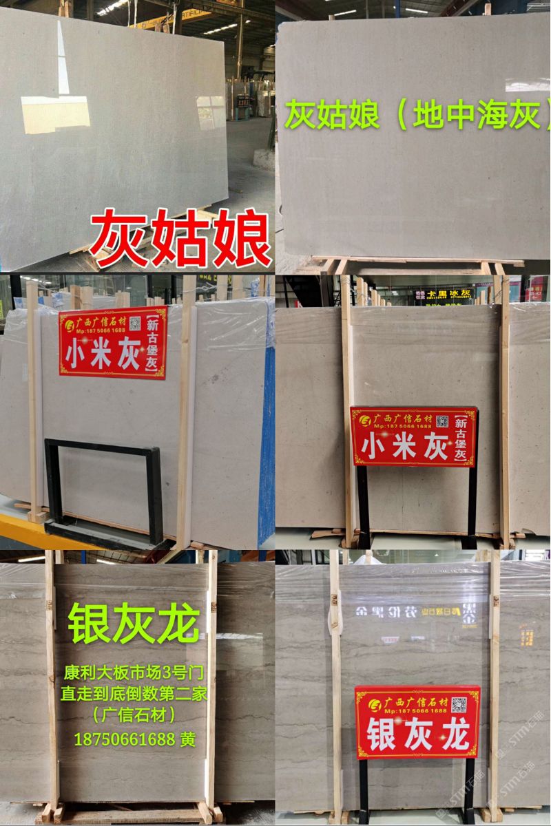 廣信石材有限公司是一家集開(kāi)采生產(chǎn),加工,銷售于一體的民營(yíng)企業(yè),主要經(jīng)營(yíng)天然大理石:灰姑娘,地中?;遥ù蟀?,條板,規(guī)格板),雅士灰,銀白龍,小米灰,美尼斯灰,新古堡灰,南極灰等各類天然大理石石材。主要銷往以色列,歐美,韓國(guó)以及國(guó)內(nèi)工程。礦山廠家直銷,廣西工廠,福建水頭,河北香河,江蘇南通均有銷售點(diǎn),歡迎您來(lái)我們直銷店或則廣西工廠實(shí)地考察參觀選購(gòu)。