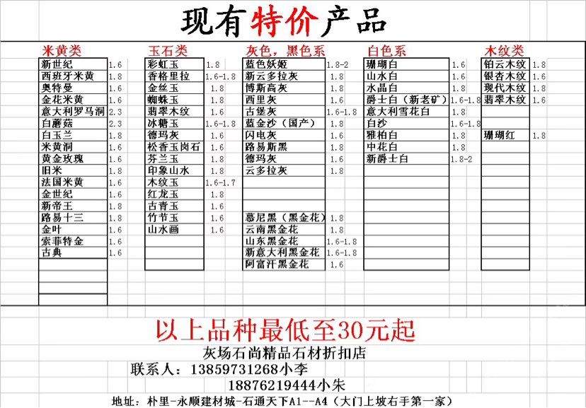 主營四大系列:玉石列、灰色列、米黃列、黑色列。以上產(chǎn)品全部一折起……石材及五金配件對接售后服務。