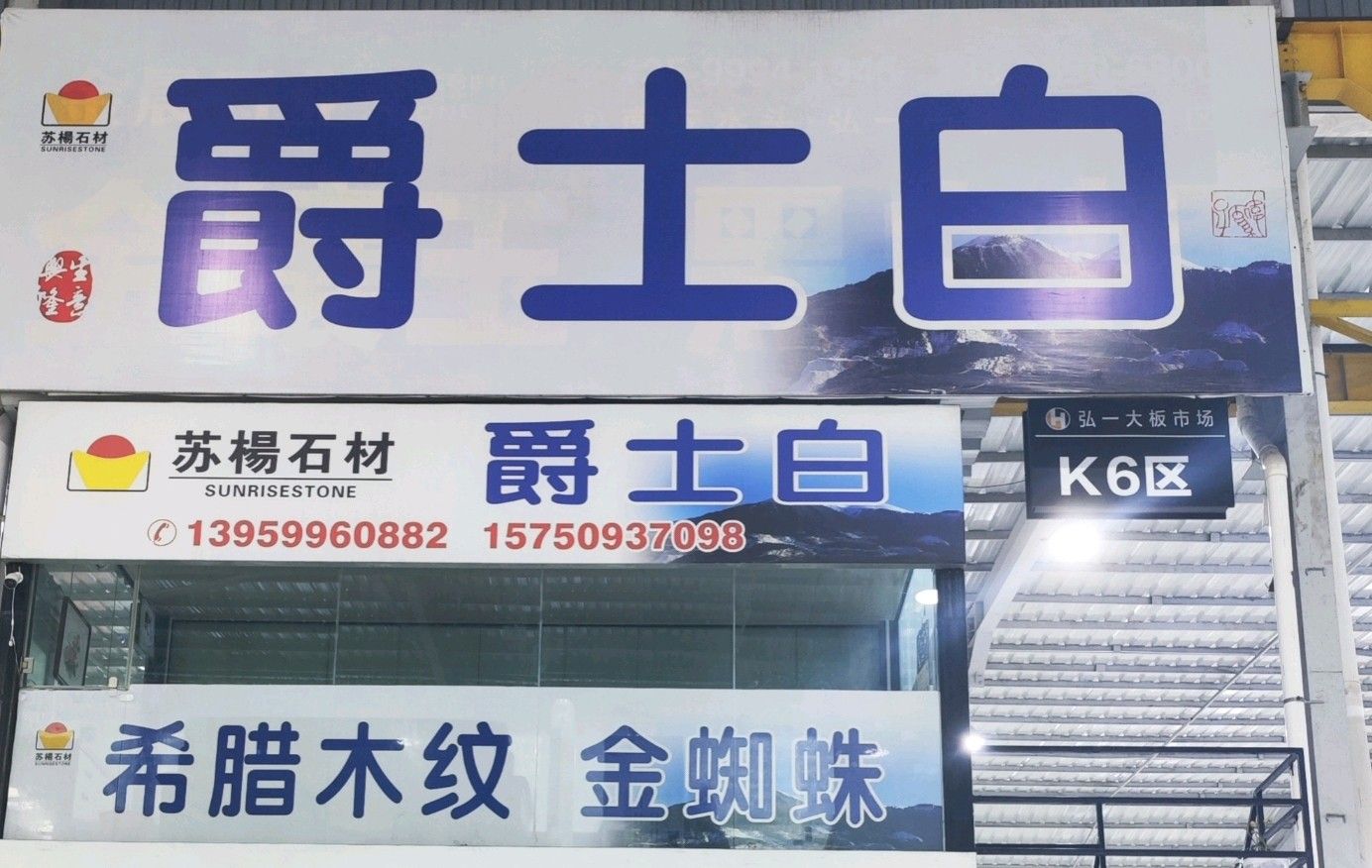 中國福建南安水頭弘一大板市場二期K6區(qū)(爵士白、威尼斯白、金蜘蛛、希臘白木紋、鎏金白玉)