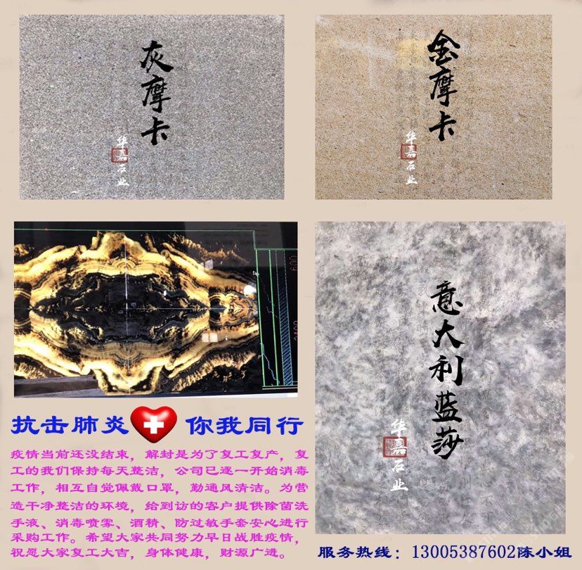 公司以代理土耳其/意大利等國的新型石材為優(yōu)勢,主營水墨玉/清水玉、歐典米黃/新莎安娜米黃、古堡灰/云多拉灰、法國米黃、伊麗莎白、皓月木紋、白玉蘭等大理石荒料及板材;承接各類大中型工。建立以六都港作為物流集散中心輻射全國各大港口、內(nèi)陸/港澳臺地區(qū)的運(yùn)輸網(wǎng)絡(luò),建成天然石板材生產(chǎn)線三條,擁有自動烘爐聚酯補(bǔ)板線一套,全自動板材晶光拋磨線一條,年產(chǎn)天然石板材500萬平方米,產(chǎn)品遠(yuǎn)銷國內(nèi)外市場。\