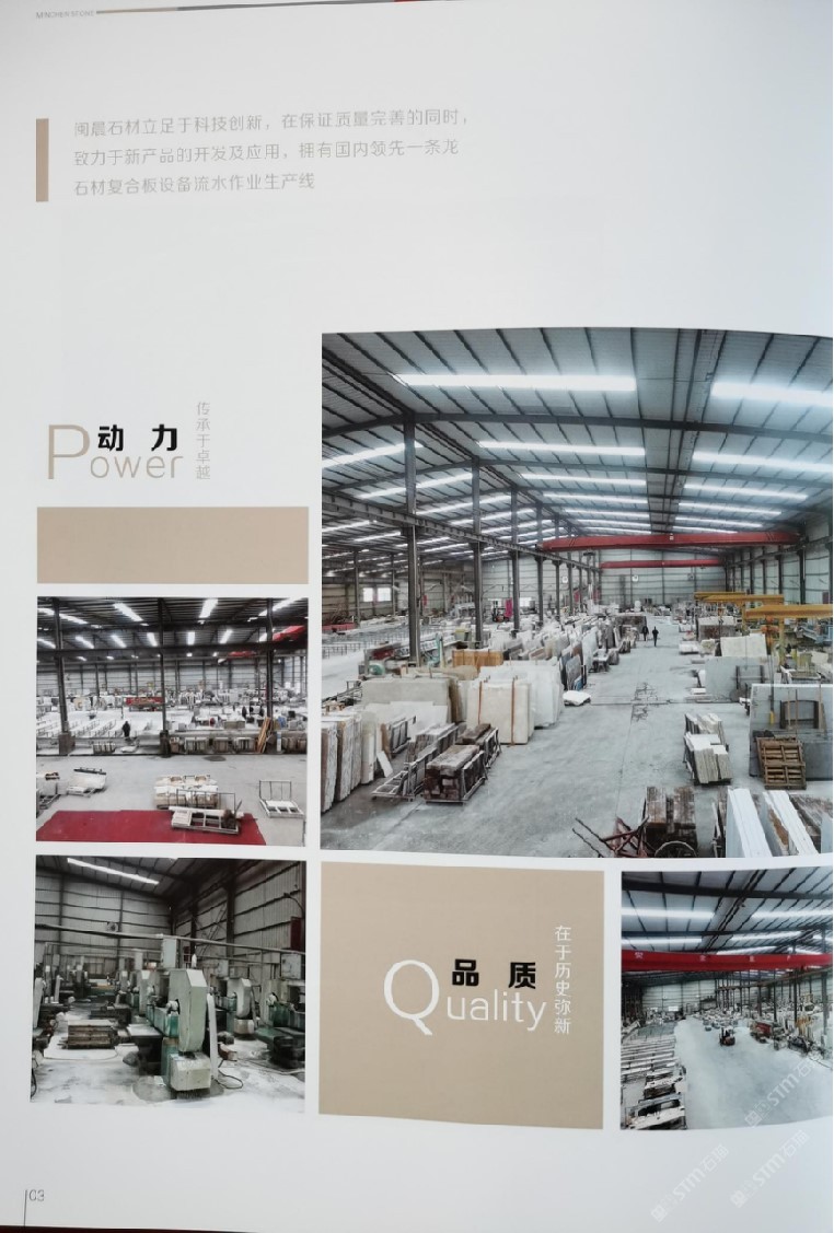 閩晨公司規(guī)模宏大。年產鋁蜂窩復合石材、保溫復合石材、瓷磚復合石材、透光復合石材、石線和傳統(tǒng)平板石材50萬平方米。公司2018年與九天龍公司融股聯(lián)合,生產保溫石材復合板,給公司輸入了新的動能和產能,增強了公司新的技術含量,把公司的業(yè)務與影響擴展到祖國的大江南北,招引了大量北方客戶,在激烈的行業(yè)競爭中公司以超前創(chuàng)新的技術,優(yōu)良人性化的服務,質優(yōu)價美的產品,疑難技術的解惑和售后服務贏得了客戶的好評與信賴。