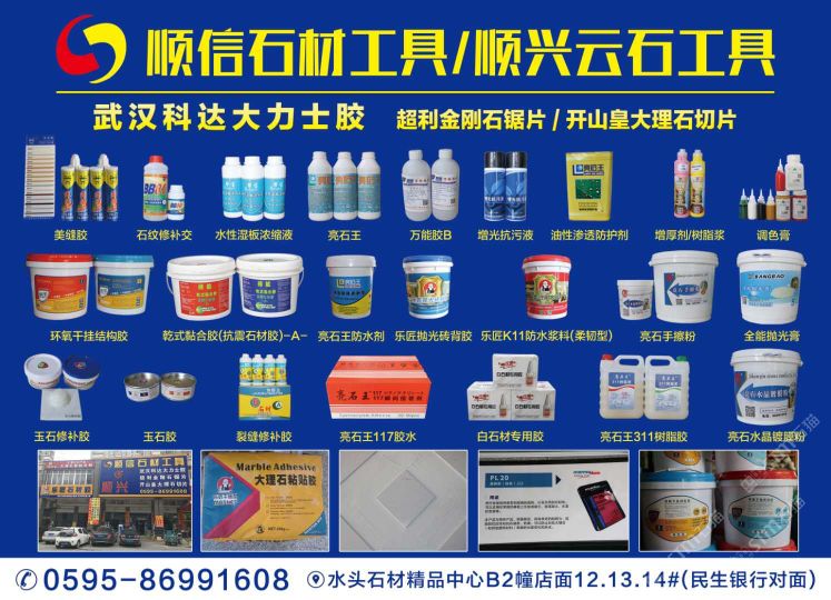 南安市順信石材工具有限公司成立于1999年,位于有“中國石材城”之稱的福建省南安市水頭鎮(zhèn)閩南建材市場內(nèi),分設(shè)石材工具護(hù)理部、干掛部兩個(gè)門市部,是一家批發(fā)、零售兼營的石材配套工具。多年來,憑借產(chǎn)品的齊全、質(zhì)量的保證、信譽(yù)的可靠、服務(wù)的周到,本商行在國內(nèi)同行中已形成自己的地位和影響,并擁有龐大的客戶群體,產(chǎn)品銷至國內(nèi)各大石材生產(chǎn)基地。我們代理的品牌有:武漢科達(dá)大力士膠、環(huán)氧膠、化學(xué)錨栓、干掛膠、植筋膠等產(chǎn)品系列;亮石王防護(hù)劑、防古水、水晶膠、樹脂膠、友豐比利蠟等產(chǎn)品;粵邦消紋劑、染色劑、百亮鋼絲棉、百潔墊;旗魚、非爾、柏興、順輝、背栓螺絲;各種款式干掛件、幕墻材料輔助產(chǎn)品;磨料磨具品牌有益和、超利、順興、閩福、芒果、金山、金鋒、智輝等;進(jìn)口、國產(chǎn)防古刷、亞光磨料、大理石磨料;意大利開山皇大理石刀具、微晶石刀具、電鍍切片、超利金鋼石切割片、軟磨片、翻新片、金鋼盤、樹脂盤;大小規(guī)格刀具、鉆頭、雕刻工具齊全;金鋼石異形輪、石材夾具、吊具、吊繩、勞保用品;電動工具、氣動工具、銅條、鋼條、合金工具等各種各樣產(chǎn)品齊全。