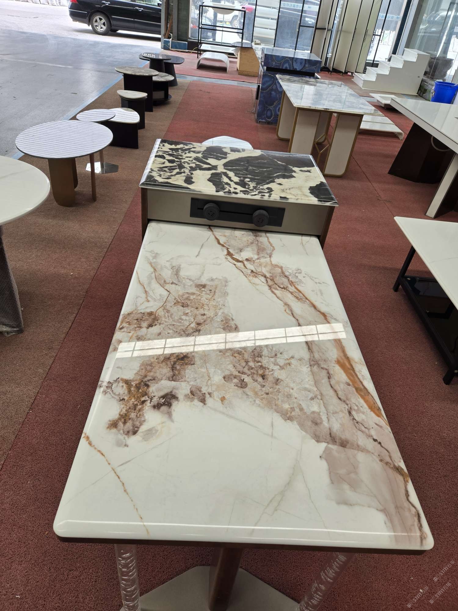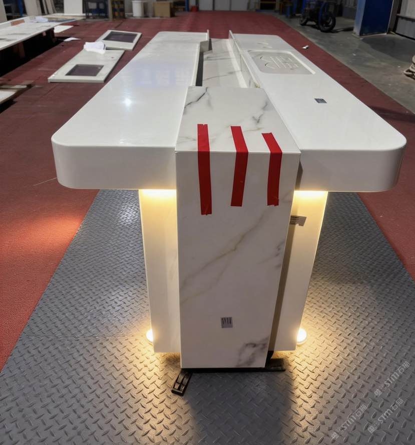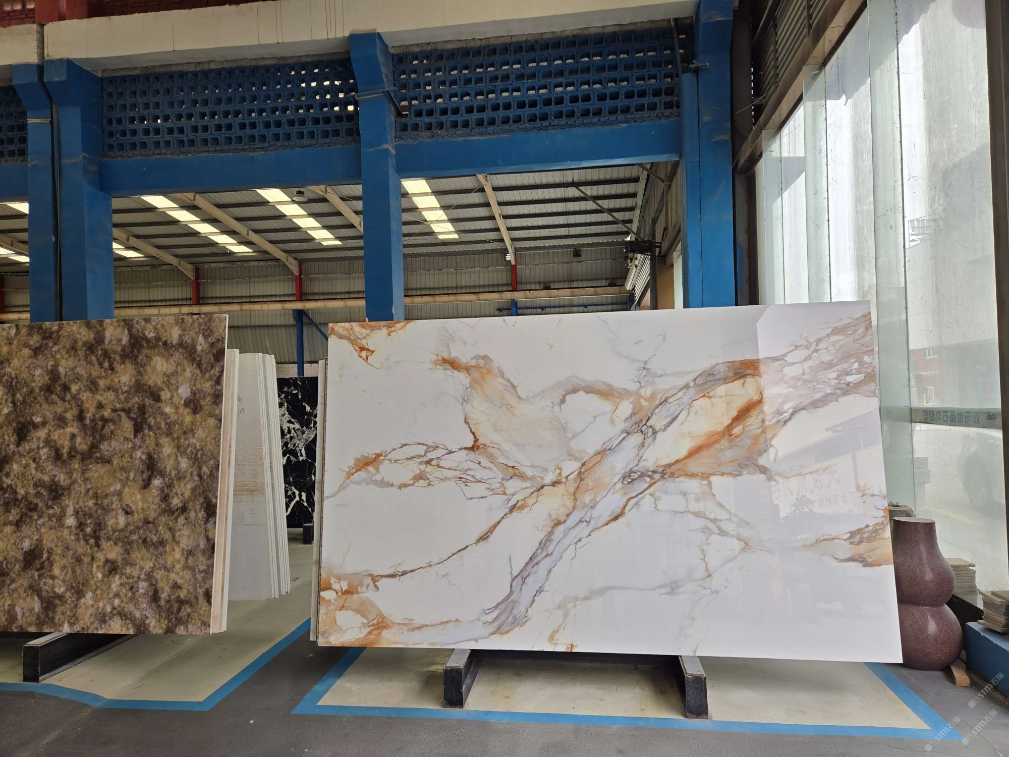 公司配有大板批發(fā)專場,同時擁有大型精加工廠房,其中各類加工器械完備,加工微晶石的工藝配套6000平方場地,并擁有建材行業(yè)各路精英成員。