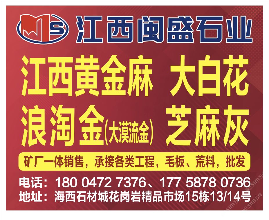 鑫山石業(yè)常年出售浪淘金(幻彩金麻),金絲麻,臺灣青,南非綠荒料,可根據(jù)客戶要求加工各種規(guī)格的薄板,延長板,荔枝板,自然板,厚板,中長板,工程板,光板,毛板,路沿石,樓梯踏步,色帶,廣場磚及自然面,荔枝面,噴砂面,火燒板等異型石材用于,高檔建筑室內(nèi)外墻面磚,地鋪石,路沿石,機拋石等,研發(fā)部門嚴把質(zhì)量關(guān),保證發(fā)貨期限,企業(yè)宗旨:“同等質(zhì)量比價格,同等價格比質(zhì)量”我廠尋求長期合作伙伴,與您攜手共創(chuàng)財富明天!浪淘金,是河北的一種優(yōu)質(zhì)黃色花崗巖,無色差,光潔度高,是裝飾內(nèi)墻、外墻、吧臺的理想產(chǎn)品,大量出口歐洲,日韓,中東等地.歡迎新老客戶來電訂購,量大價格優(yōu)惠。咨詢熱線: 17758780736 呂