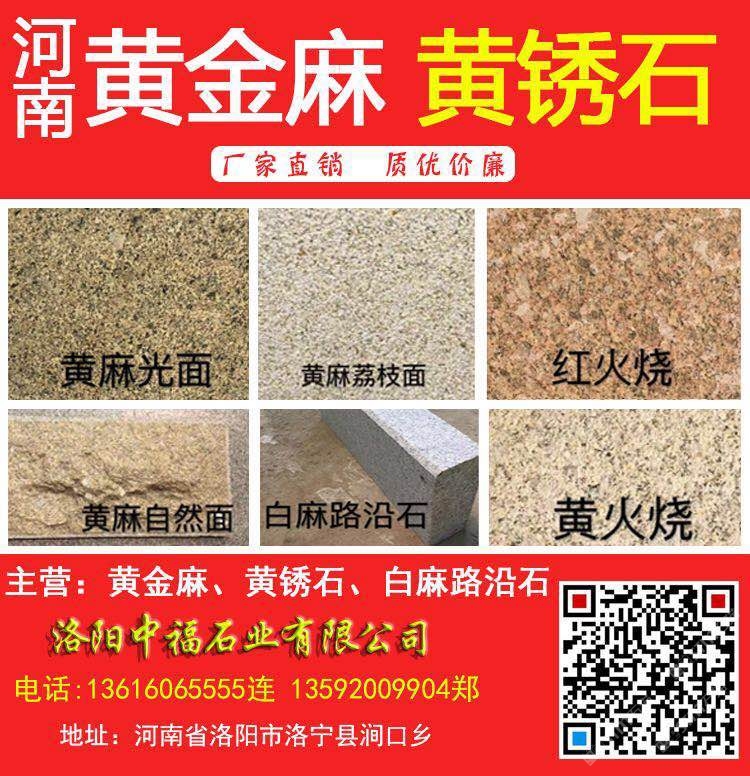 洛陽(yáng)中福石業(yè)(電話:13616065555連17036286666連13592009904鄭)是河南黃金麻、河南黃銹石、河南白麻、河南芝麻白、角美銹、龍海銹、漳浦銹、g682石材、g682花崗巖、黃金麻花崗巖、黃金麻石材、黃色石材、黃色花崗巖、荒料、路沿石、墓碑石、工程面板、異型加工、芝麻黑廠家、花崗巖石材、幕墻石材、干掛板、馬路牙子、水溝蓋板、花圍樹(shù)圍、荔枝面、火燒面、磨光面花崗巖板材等產(chǎn)品專(zhuān)業(yè)生產(chǎn)加工的工廠,擁有完整、科學(xué)的質(zhì)量管理體系。洛陽(yáng)中福石業(yè)有限公司的誠(chéng)信、實(shí)力和產(chǎn)品質(zhì)量獲得業(yè)界的認(rèn)可。歡迎各界朋友蒞臨參觀、指導(dǎo)和業(yè)務(wù)洽談。河南黃麻光面河南黃麻荔枝面河南紅火燒河南黃麻自然面河南白麻路沿石/道牙石/路緣石/路側(cè)石/鋪路石/路邊石河南黃火燒面河南黃金麻河南黃銹石/河南黃金鉆石材/河南芝麻白/河南白色花崗巖/河南白色石材/河南黃色石材/河南黃色花崗巖