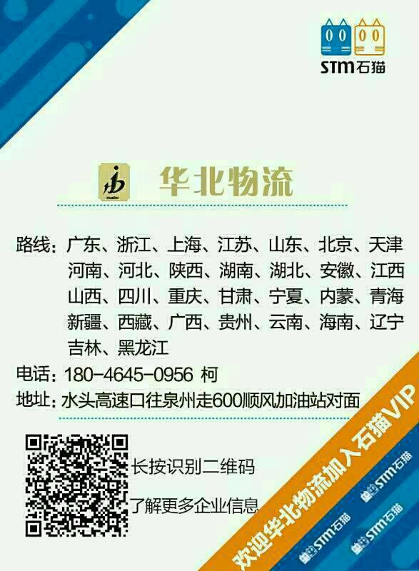 發(fā)布信息: 福建華北物流?貨運(yùn)站: 承接福建--全國(guó)各地貨運(yùn),整車(chē),零擔(dān),我們的專(zhuān)線浙江,海南、合肥、北京、重慶、廣西、貴州、武漢、鄭州、江蘇、山東、上海、西安、廣東、成都、天津、云南、杭州、河北、長(zhǎng)沙、東北三省整車(chē)零擔(dān)歡迎來(lái)電洽談!謝謝!真誠(chéng)合作、共創(chuàng)雙贏 18046450956微信15905961654微信13115957597微信小柯