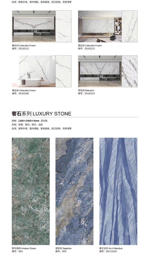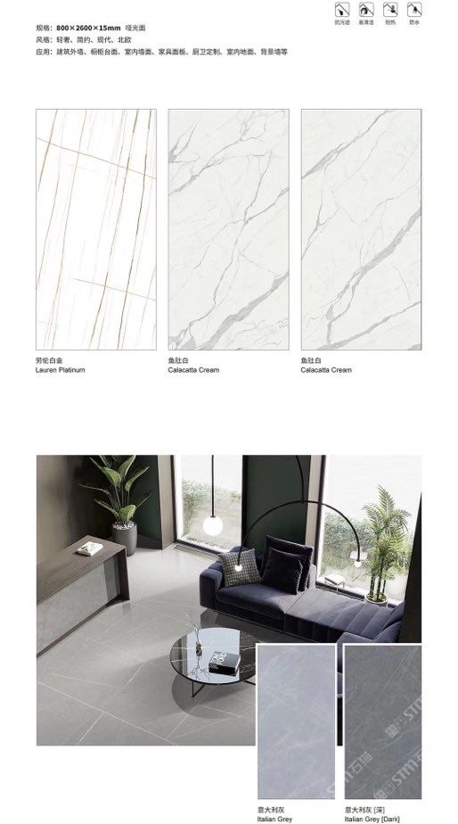 發(fā)布信息: ????SIBELAN 斯貝納巖板???? ????意大利設(shè)計(jì)師精選巖板???? 我們可以幫老總您加工為成品, 全國范圍內(nèi)可安排專業(yè)團(tuán)隊(duì)安裝. 做到您一次性采購 省心. 放心. 省時(shí). 低價(jià)! 巖板紋路版面全多達(dá)199 款 勵志做服務(wù)五星的巖板專業(yè)供應(yīng)商 魚肚白 雪花白 格蘭云天 寒江雪 爵士白 幻影灰 勞倫黑金 火山灰 亞馬遜 艾維拉 羅馬黑檀 貝特巖 細(xì)花白 羅馬灰 云朵拉灰 魚肚金 莎羅娜 莎羅蘭 勞倫白金 拉薩白 中花白 灰冰玉 卡拉拉白 撒金黑 清水玉 薩瓦灰 莎士比亞 大花灰 白冰玉 銀灰洞 阿瑪尼灰 綠紋玉 綠冰玉 藍(lán)紋玉 保加利亞灰 鐵銹 黑木紋 流砂灰 純白 純灰 純黑 TEL: 15905069590 聶 各種版面規(guī)格全部如下: 1200×600×11mm 啞光 1500×800×11mm 啞光 1800×900×11mm 啞光 1800×900×12mm 啞光 2600×800×15mm 啞光 2400×1200×6mm 啞光/亮光 2400×1200×9mm 啞光/亮光 2400×1200×15mm 啞光 2700×1200×6mm 啞光/亮光 2700×1600×12mm 啞光/亮光 3200×1600×6mm 啞光/亮光 3200×1600×12mm 啞光/亮光