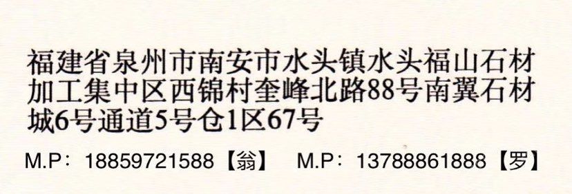 銀貝殼石業(yè) 聯(lián)系人:翁先生    152****9685 查看 手機號碼:無 主營范圍: 大板批發(fā)、荒料、大理石加工、礦山、 企業(yè)地址:福建泉州水頭鎮(zhèn)南翼6通道5號倉