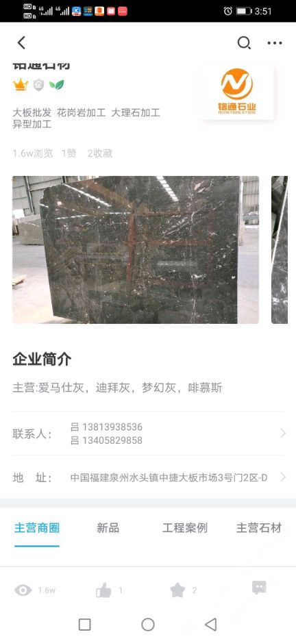 銘通石材 聯(lián)系人:呂    138****8536 查看 134****9858 查看 主營范圍: 大板批發(fā)、花崗巖加工、大理石加工、異型加工、 企業(yè)地址:福建泉州水頭鎮(zhèn)中捷大板市場3號門3區(qū)-D