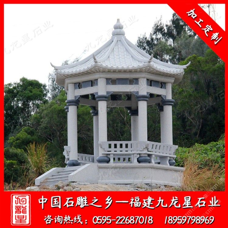 發(fā)布信息: 福建九龍星石業(yè)發(fā)展有限公司以“以誠為本、以質(zhì)取信”。從事石雕行業(yè)二十多年,石雕涼亭款式多樣,有四角石涼亭、六角石亭子、八角石雕涼亭,價格合理。石雕涼亭材質(zhì)可以為花崗巖、大理石等等,望廣大新老客戶前來參觀考察和選購(電話:18959798969)。 石雕亭子已經(jīng)成為城市園林和自然山水增添美色的重要點綴建筑物。既增加了園林的情趣,又豐富了園林的景觀。 石雕亭子風(fēng)姿獨具是特意為方便過往行人建筑的,山路從石雕涼亭中穿堂而過。園林石亭子的樣式,有四角的亭子、六角的亭子,八角形的亭子,扇形的亭子,還有雙層亭子和三層亭子之分。石雕涼亭在中國園林的意境中起到很重要的作用。