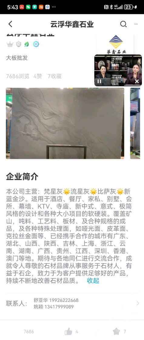 云浮華鑫石業(yè) 聯(lián)系人:舒亞華    199****2668 查看 181****6868 查看 主營(yíng)范圍: 大板批發(fā)、 企業(yè)地址:廣東云浮百家石材城三通道D08處170號(hào)卡