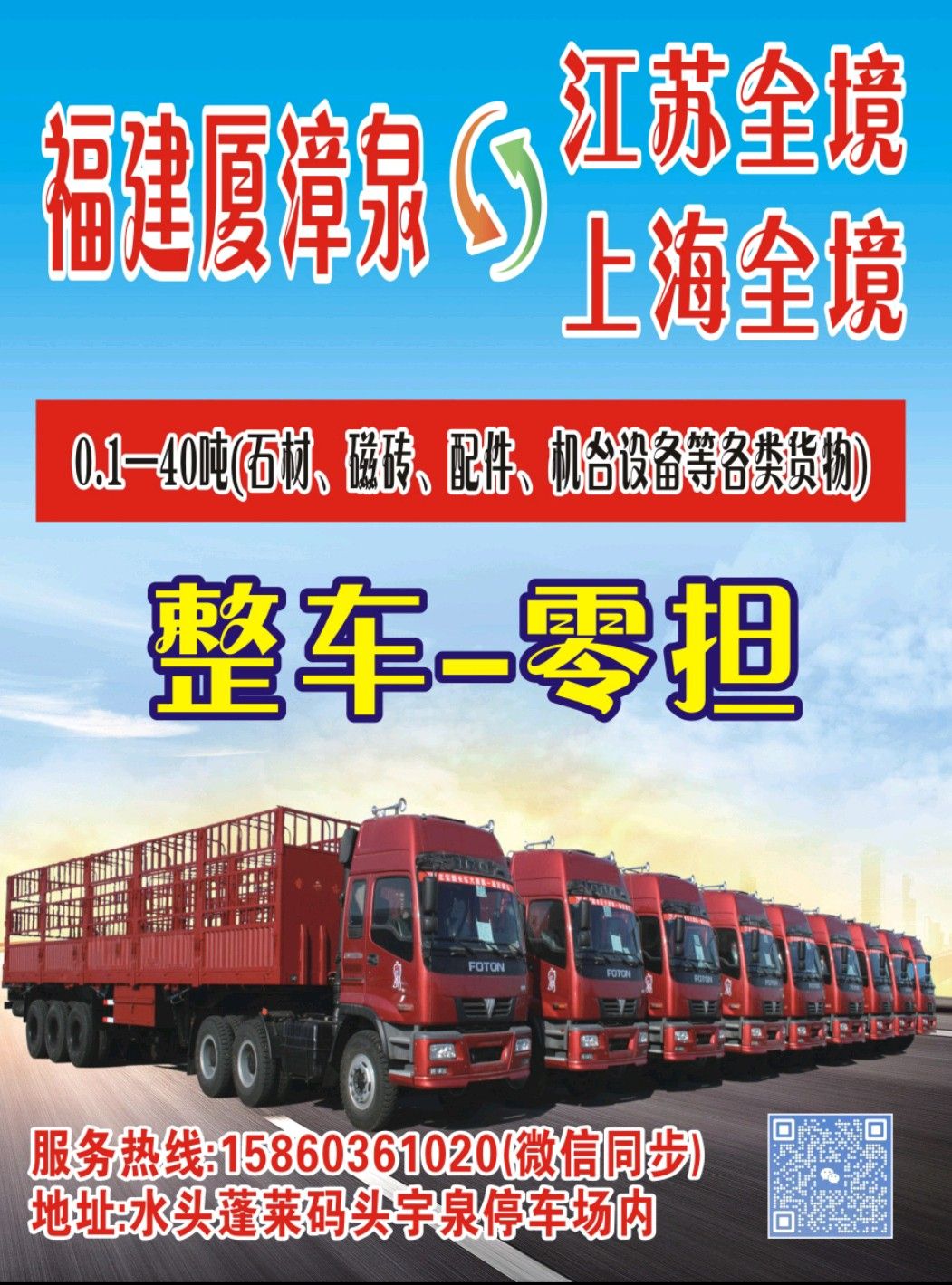 發(fā)布信息: 福建泉州水頭—江蘇,上海全境,往返專(zhuān)線。 零擔(dān)~整車(chē),0.1噸—40噸。 承接各類(lèi)石材,瓷磚,機(jī)械等各類(lèi)運(yùn)輸。 專(zhuān)注運(yùn)輸,用心服務(wù)。可開(kāi)發(fā)票。 江蘇專(zhuān)線15860361020。(微信同步)