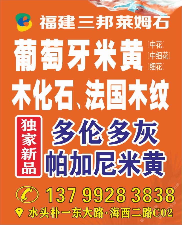 福建三邦石業(yè) 聯(lián)系人:高先生    137****5858 查看 手機(jī)號(hào)碼:無(wú) 主營(yíng)范圍: 大板批發(fā)、異型加工、礦山、石材雕刻、石材工藝品、石材工程資質(zhì)企業(yè)、石材交易市場(chǎng)、水刀拼花、荒料、環(huán)境石材、 企業(yè)地址:福建泉州樸一工業(yè)區(qū)東大路(直走200米)