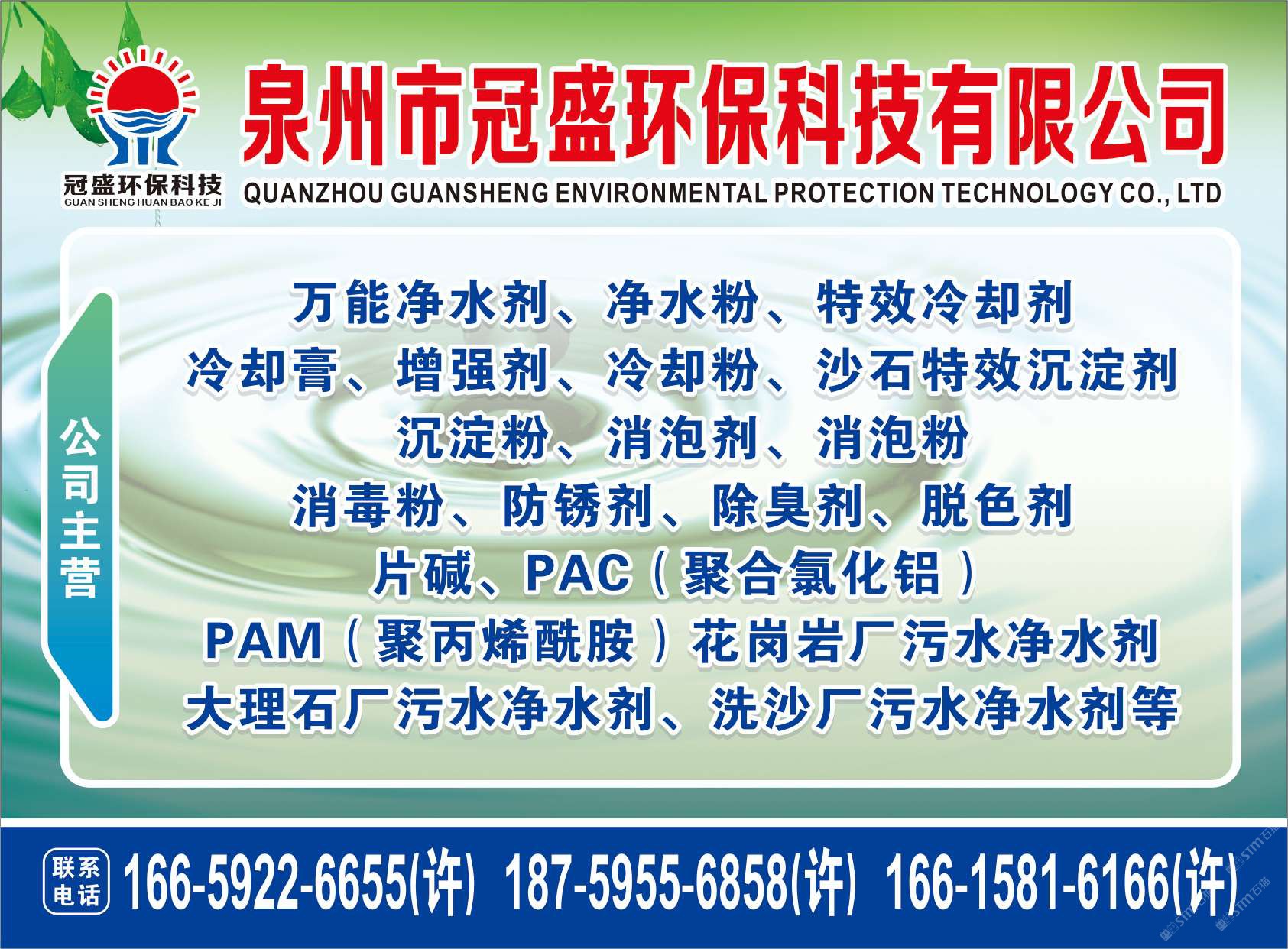 發(fā)布信息: 冠盛環(huán)??萍?8759556858 主營(yíng)產(chǎn)品:凈水劑,冷卻劑,冷卻粉,大理石人造石專(zhuān)用凈水劑,沉淀粉,消泡劑,消毒凈水劑,防銹凈水劑,除銹劑,除臭劑,聚丙烯酰胺,聚合氯化鋁,鹵精,洗沙專(zhuān)用凈水劑,壓濾機(jī)專(zhuān)用凈水劑,陶瓷廠專(zhuān)用凈水劑(黃藥 白藥)等所有水處理環(huán)保材料……