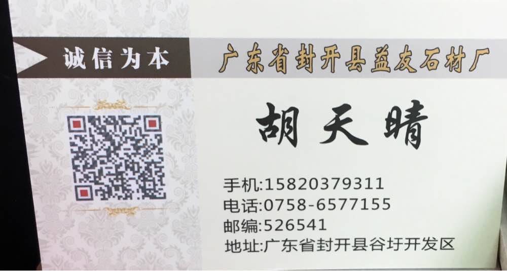 廣東省肇慶市益友石材廠 聯(lián)系人:胡天晴    158****9311 查看 手機號碼:無 主營范圍: 花崗巖加工、荒料、大板批發(fā)、石材交易市場、 企業(yè)地址:廣東肇慶封開縣S266兩廣石材交易市場