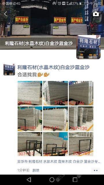 利隆石材 聯(lián)系人:李生    138****8669 查看 手機(jī)號(hào)碼:無 主營范圍: 大板批發(fā)、荒料、 企業(yè)地址:廣東云浮云城區(qū)夏洞格木橋加油站側(cè)