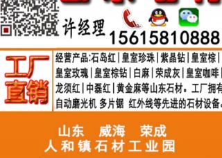 山東省榮成市人和石材園主營(yíng)產(chǎn)品:皇室玫瑰,皇室玫瑰1,皇室玫瑰2,皇室棕,皇室棕鉆,紫晶鉆2,紫晶鉆1,紫晶鉆,石島紅,石島紅(老8號(hào)),石島紅(7號(hào)),石島紅(新8號(hào)),文登灰企業(yè)地址:山東威海榮成市人和石材園